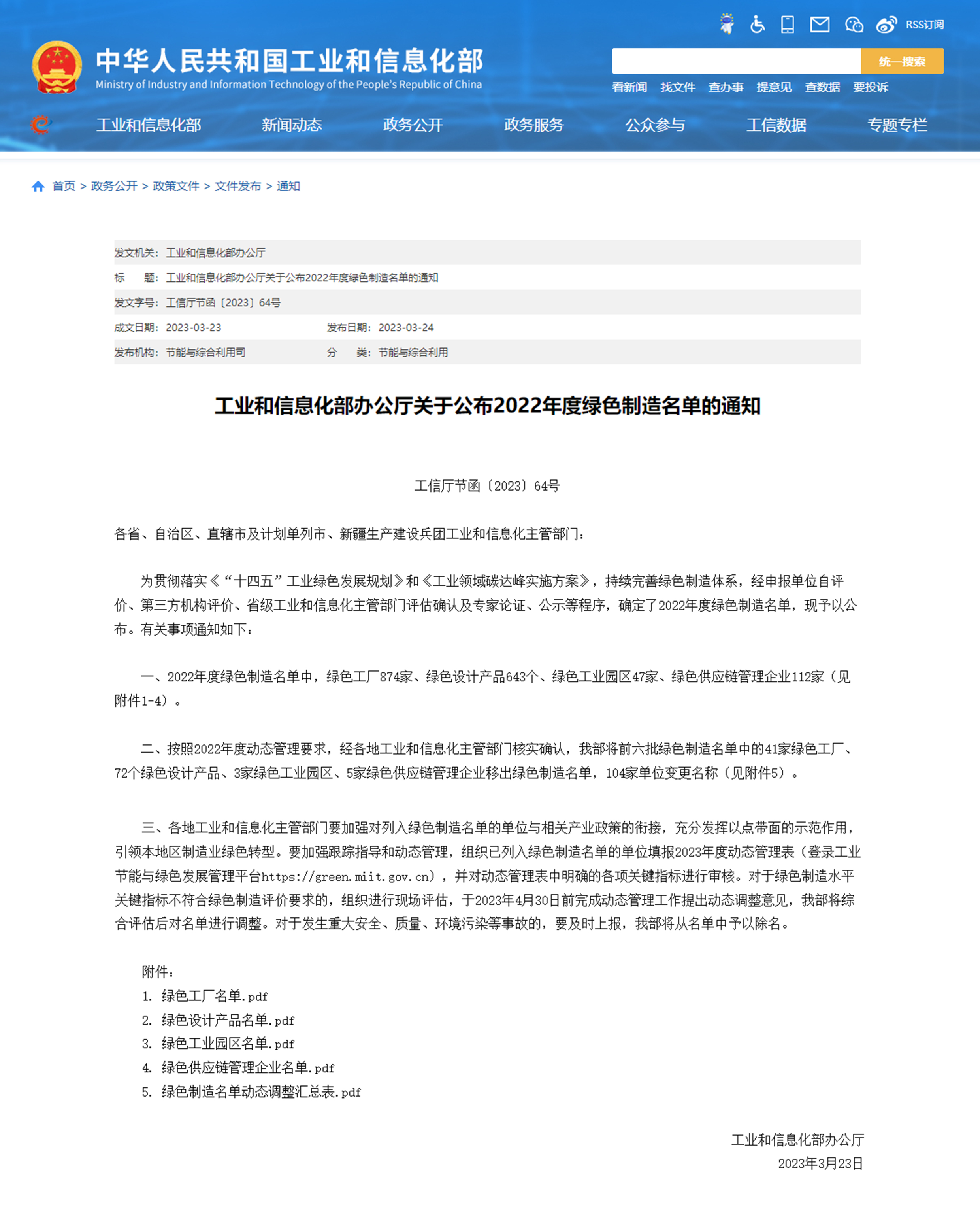 近日,國家工業和信息化部發布的《關於公布2022年度綠色製造名單的通知》,佛山市操逼APP下载大全智能裝備股份有限公司(以下簡稱“公司”)入選“綠色供應鏈管理企業”名單。