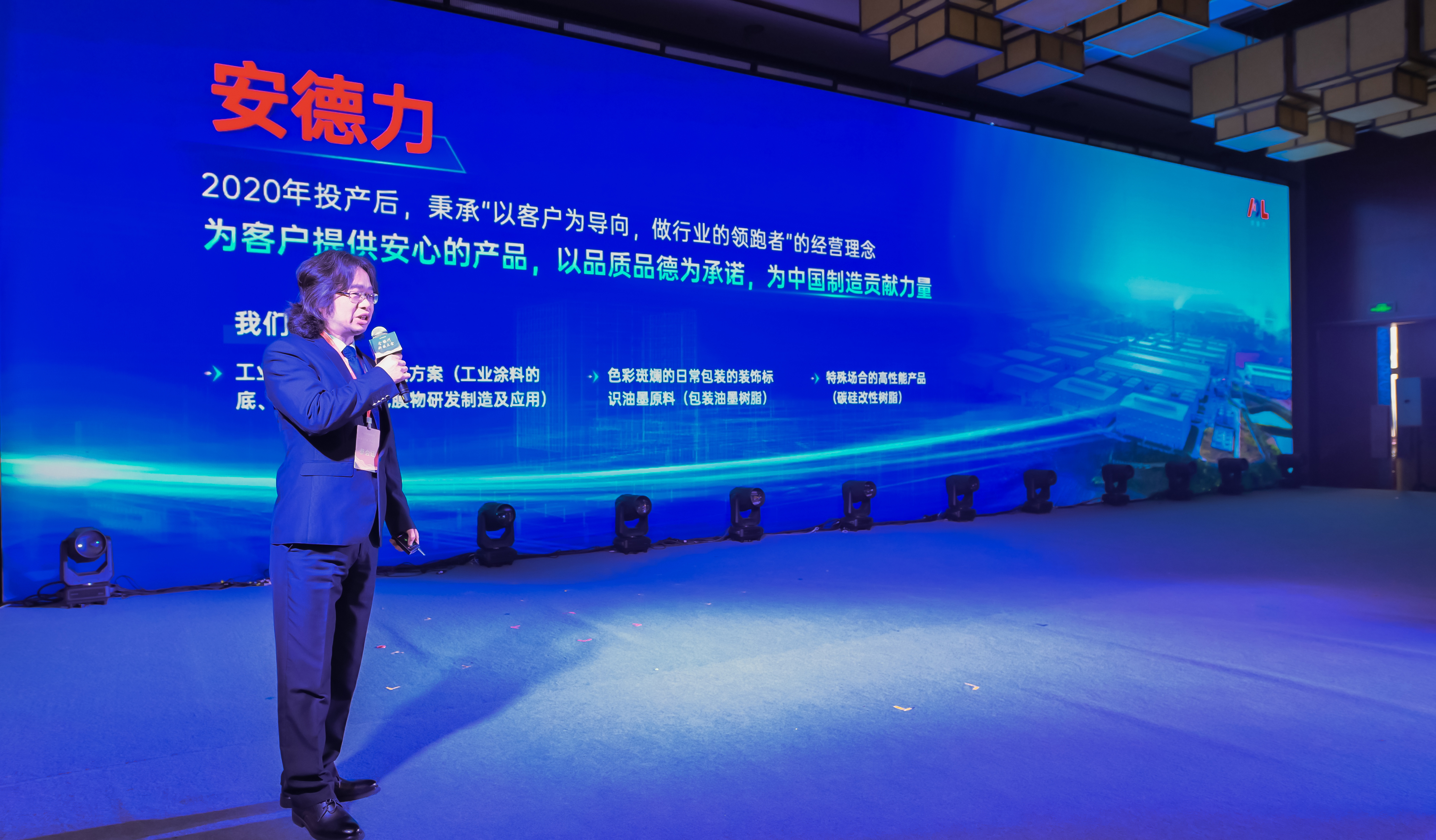 江西安德力高新科技有限公司副總經理王立峰先生,介紹了安德力在環保油墨樹脂、水性工業塗料樹脂、碳矽改性材料的性能及應用,為多個行業提供了綠色、高效的應用解決方案。