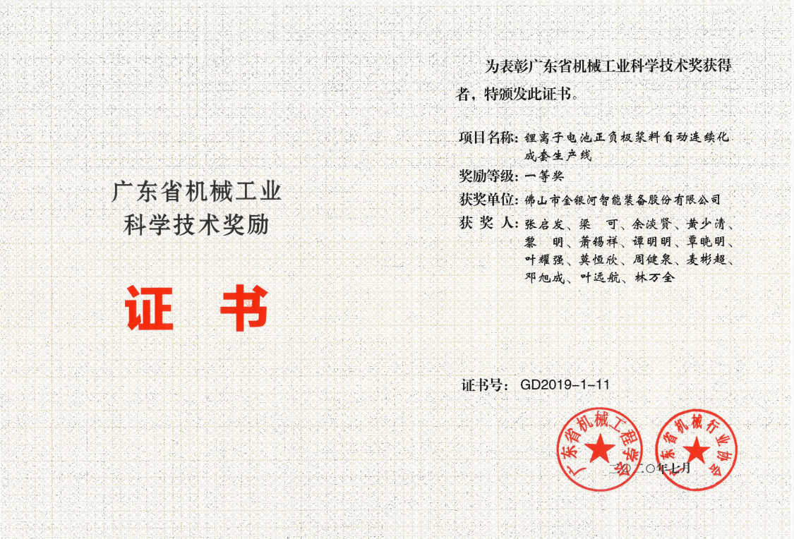 2020年7月,操逼APP下载大全項目“操逼免费下载网站電池正負極漿料自動連續化成套生產線”被廣東省機械工程學會、廣東省機械行業協會授予“廣東省機械工業科學技術一等獎”。