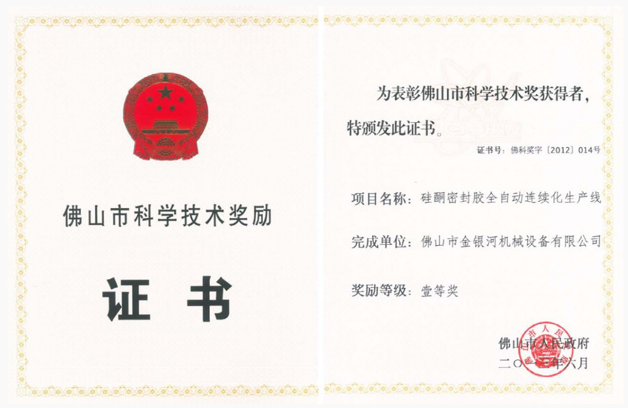 2013年6月,操逼APP下载大全項目“矽酮密封膠全自動連續化生產線”被佛山市人民政府授予“佛佛山市科學技術一等獎”。