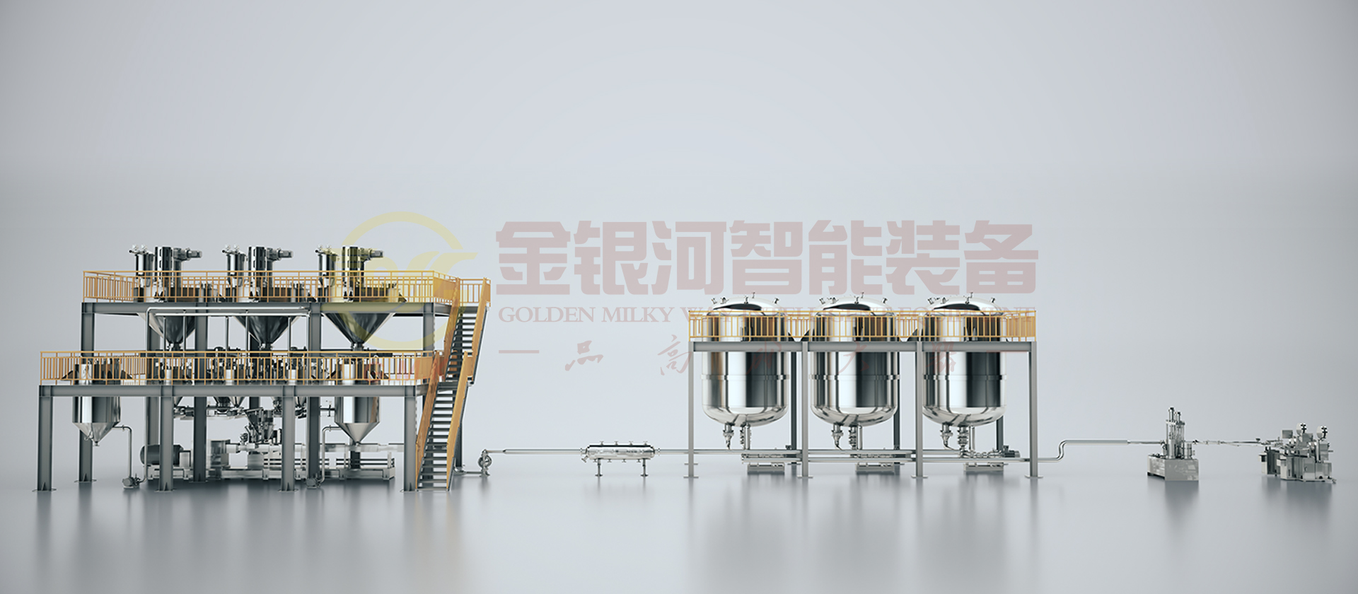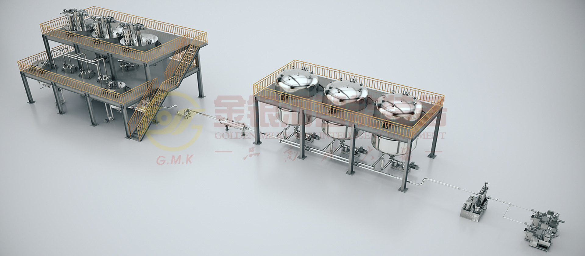 由計量鬥、稱量及輸送係統、貯罐、冷卻器、喂料機、雙螺杆螺旋混合機、輔助設備及DCS中央控製係統組成。原材料(粉體與液體)通過精確的計量係統在線自動和連續輸送到螺旋混合機中,在雙螺杆螺旋混合機中完成粉液完成混合、分散、研磨、抽真空,並通過在線加入液料至其中,並輸出進入貯罐暫存,後段接靜態混合機即可完成雙組分電源灌封膠產品輸出。它的生產效率高,適合大規模生產;它具有自動化程度高,杜絕物料直接接觸空氣,產品質量穩定性好,物料及能源損耗少等優點。
