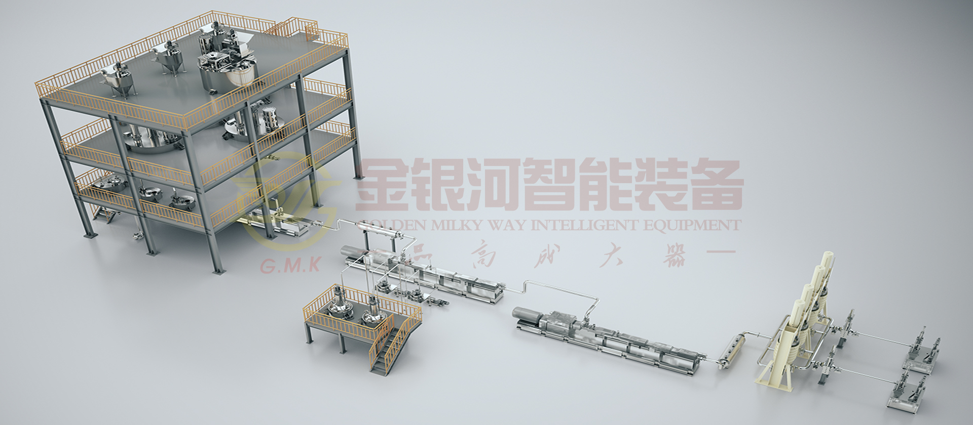 由計量鬥、稱量及輸送係統、貯罐、冷卻器、多工位出料機、喂料機、網式過濾器、雙螺杆螺旋混合機、輔助設備及DCS中央控製係統組成。原材料(粉體與液體)通過精確的計量係統在線自動和連續輸送到一階螺旋混合機中,在一階螺旋混合機中完成混合、分散、研磨、抽真空等產出基料後進入二階螺旋混合機再到三階螺旋混合機,中途克服解決了物料的物料粘度高峰,通過在線助劑至其中,完成混合、分散、抽真空等完成品料製作並輸出進入多工位出料機暫存,多工位機出料機輪流交替出料過濾包裝。它的生產效率高,適合大規模生產;它具有自動化程度高,杜絕物料直接接觸空氣,產品質量穩定性好,物料及能源損耗少等優點。