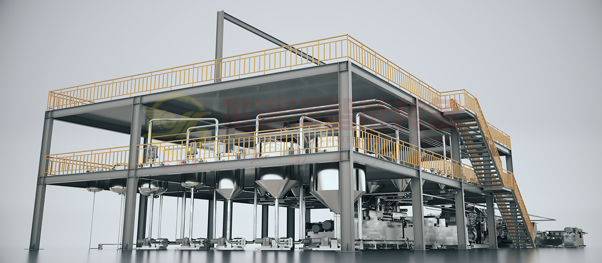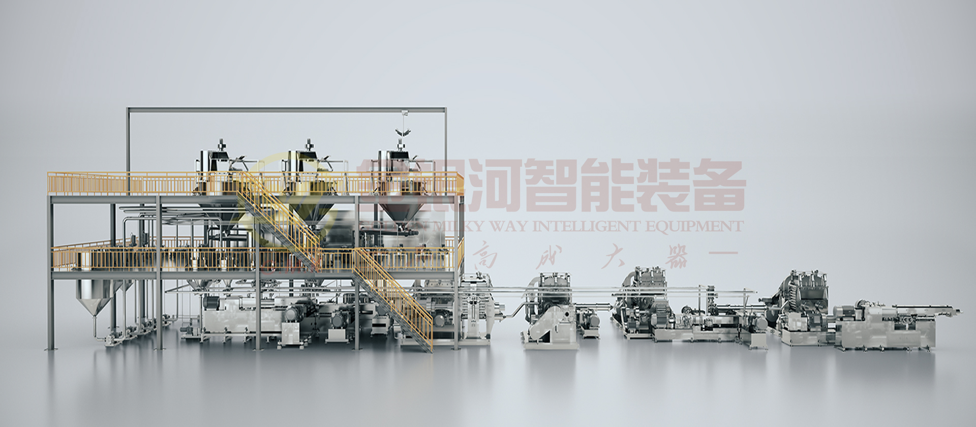 由計量鬥、稱量及輸送係統、貯罐、多工位出料機,增壓機、靜態混合機、雙螺杆螺旋混合機、輔助設備及DCS中央控製係統組成。液體的原材料(粉體與液體)通過精確的計量係統在線自動和連續輸送到螺旋混合機中,液體膠的原材料(粉體與液體)通過精確的計量係統在線自動和連續輸送到螺旋混合機中,分三段完成粉液混合,對產能大大提高,產出基料後進入多工位機臨存反應,再通過雙螺杆螺旋混合機完成混合、分散、研磨、抽真空等完成基膠後進入在線靜態混合機加入助劑再次混合,經雙螺杆螺旋混合機在線冷卻後包裝。它的生產效率高,適合大規模生產;它具有自動化程度高,杜絕物料直接接觸空氣,產品質量穩定性好,物料及能源損耗少等優點。