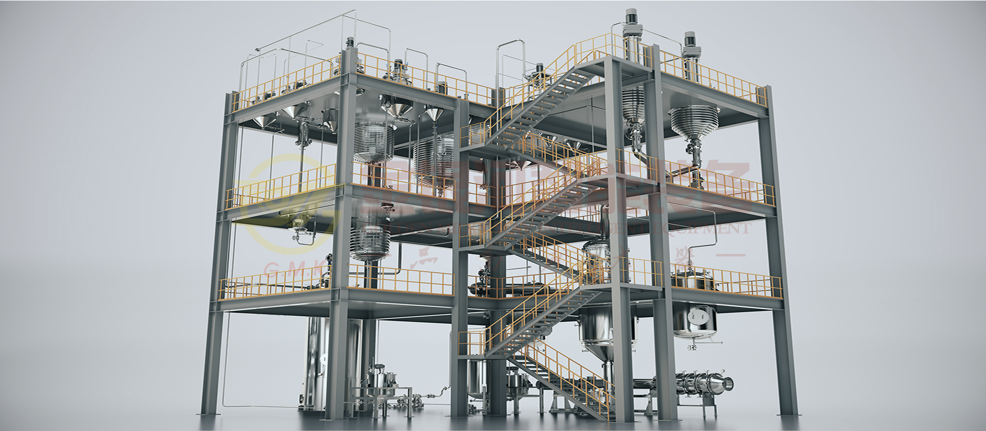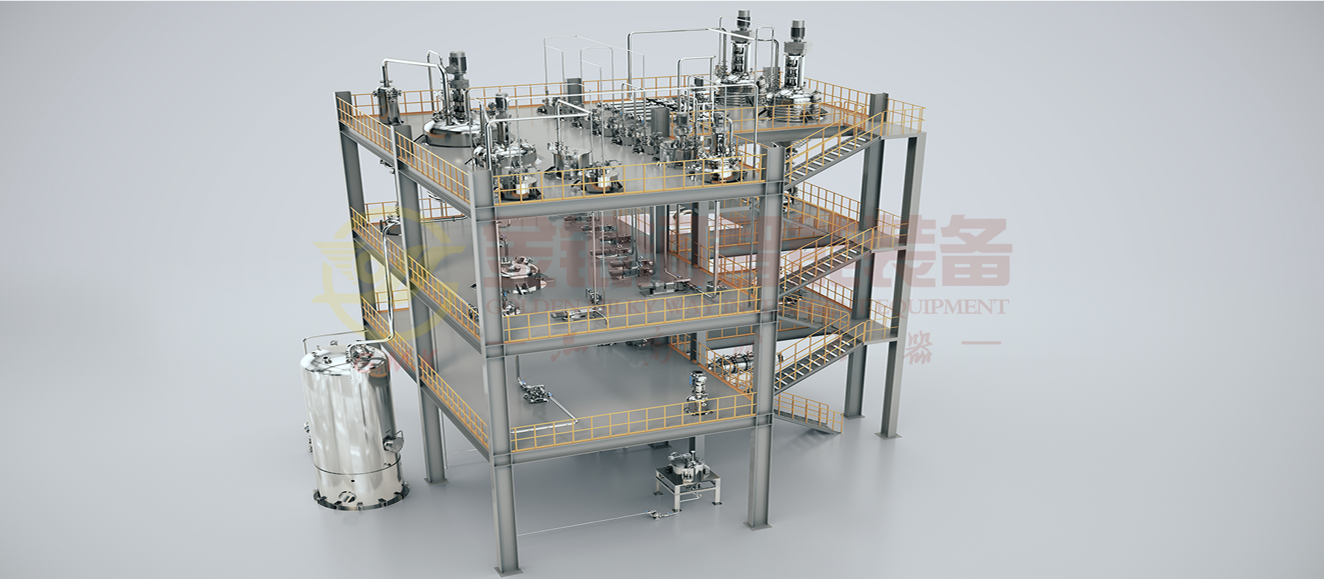 由計量鬥、稱量及輸送係統、貯罐、加熱器、冷卻器、在線混合單螺杆、聚合反應釜、脫低分子器、單螺杆出膠機、輔助設備及DCS中央控製係統組成。生膠的原材料(液體)通過精確的計量係統在線自動和連續加入至混合單螺杆中,前期可先通過加熱器預熱已脫水的DMC,縮短液體料在混合單螺杆中的反應時間後進入混合單螺杆機中,並同時在線加入堿膠、乙烯基矽油、封頭油等液體料,通過加熱升溫,使其在混合單螺杆機中完成聚合反應後進入聚合釜內(多台釜輪流切換使用,達到不停機效果),後送料至脫低分子器加熱升溫,抽真空脫低得到產品,並通過單螺杆出膠機把產品推送到冷卻器冷卻出料包裝,單螺杆出膠機可實現同時抽真空同時出料的功能,真正做到連續自動化。它的生產效率高,適合大規模生產;它具有自動化程度高,杜絕物料直接接觸空氣,產品質量穩定性好,物料及能源損耗少等優點。