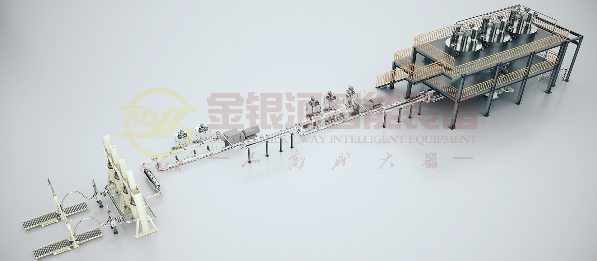 由計量鬥、稱量及輸送係統、貯罐、冷卻器、多工位出料機、喂料機、增壓泵、網式過濾器、雙螺杆螺旋混合機、輔助設備及DCS中央控製係統組成。光伏的原材料(粉體與液體)通過精確的計量係統在線自動和連續輸送到一階螺旋混合機中,在一階螺旋混合機中完成混合、分散、研磨、抽真空等產出基料後進入二階螺旋混合機再到三階螺旋混合機,通過在線加入色漿及助劑至其中,完成混合、混色、分散、研磨、抽真空等完成品料製作並輸出進入多工位出料機暫存,多工位機出料機輪流交替出料過濾包裝。它的生產效率高,適合大規模生產;它具有自動化程度高,杜絕物料直接接觸空氣,產品質量穩定性好,物料及能源損耗少等優點。