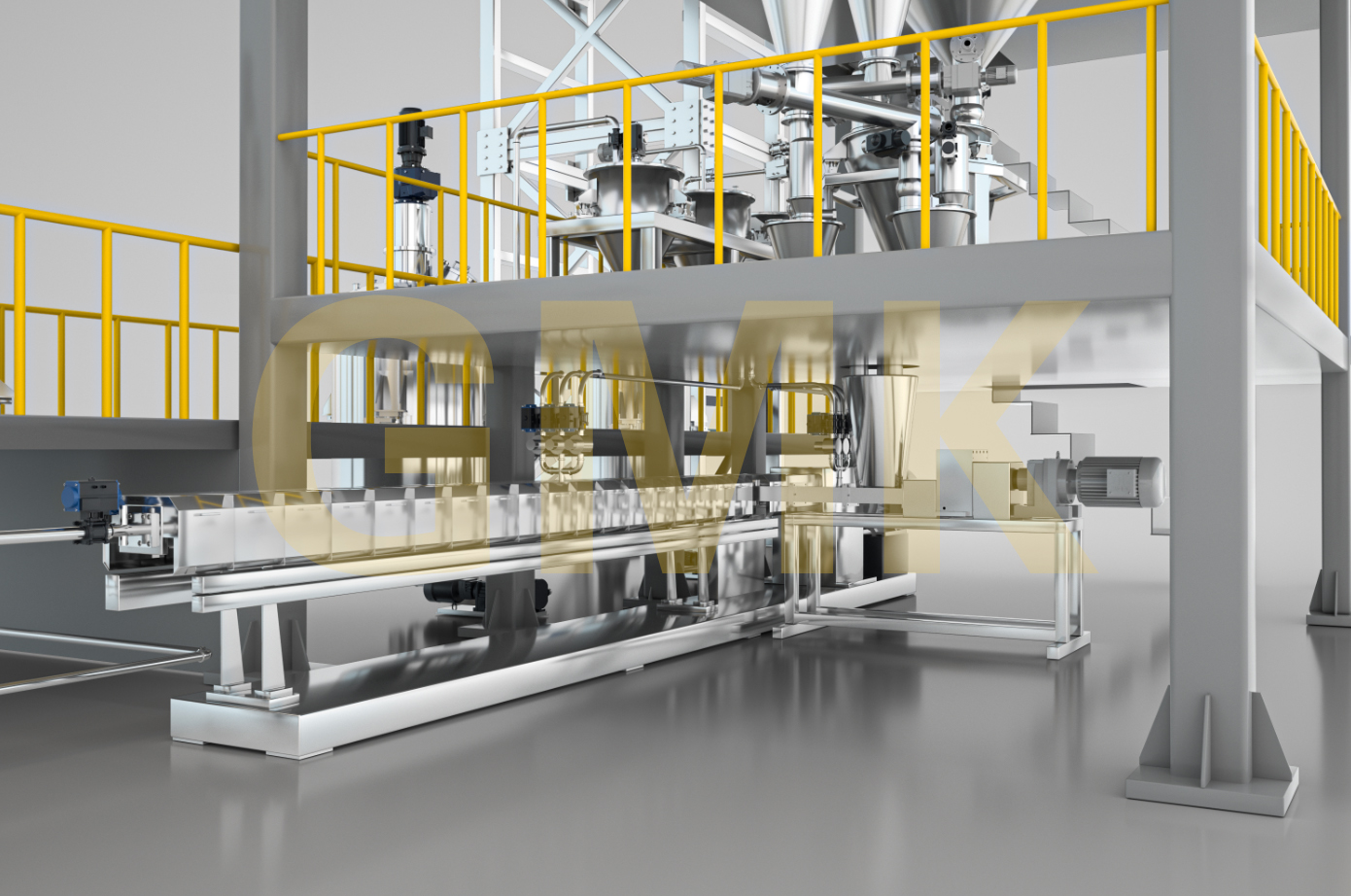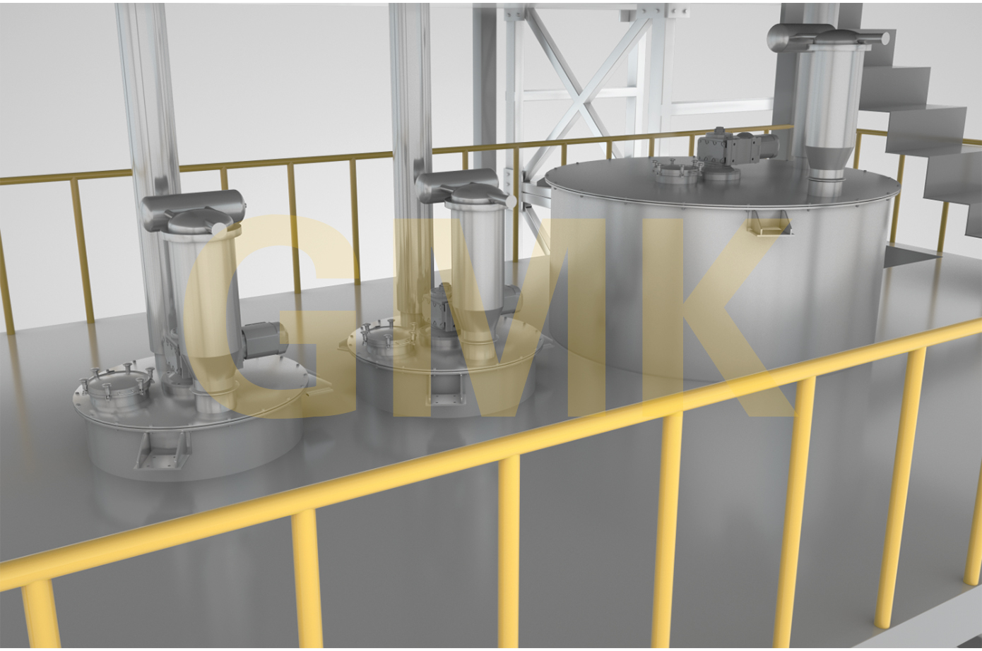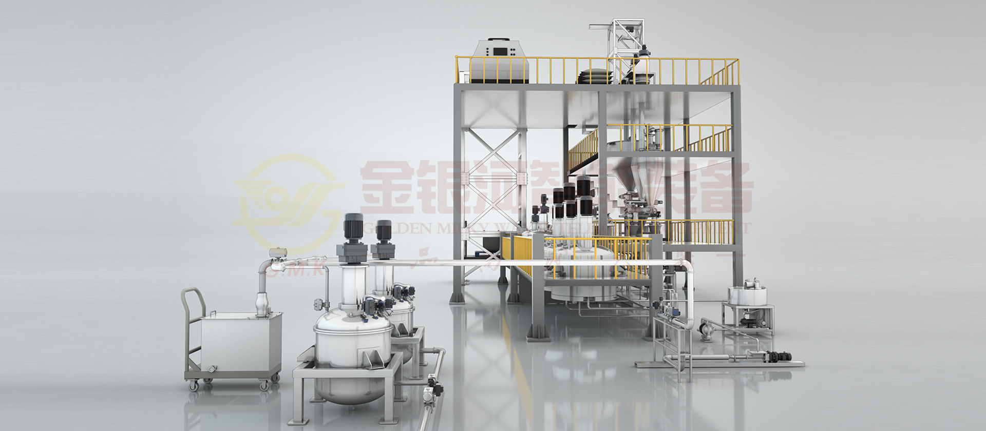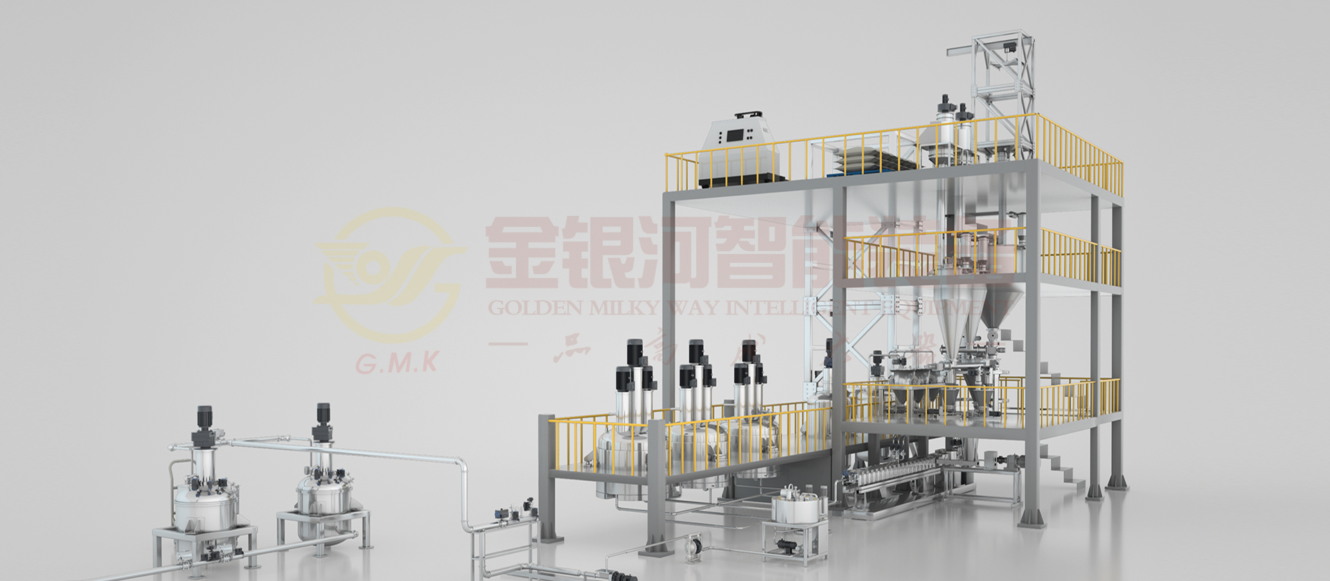 由計量鬥、稱量及輸送係統、貯罐、製膠罐、中轉罐、喂料機、高速混料機、增壓泵、磁性式過濾器、高速均質機、輔助設備及DCS中央控製係統組成。鋰電池的正、負極原材料(粉體與液體)通過精確的計量係統在線自動和連續輸送到螺旋混合機中、在螺旋混合機中完成混合、分散、研磨、抽真空等操作形成漿料,然後漿料連續從螺旋混合機中輸出進入下道生產工序。它的生產效率高,適合大規模生產;它具有自動化程度高,杜絕物料直接接觸空氣,產品質量穩定性好,物料及能源損耗少等優點。